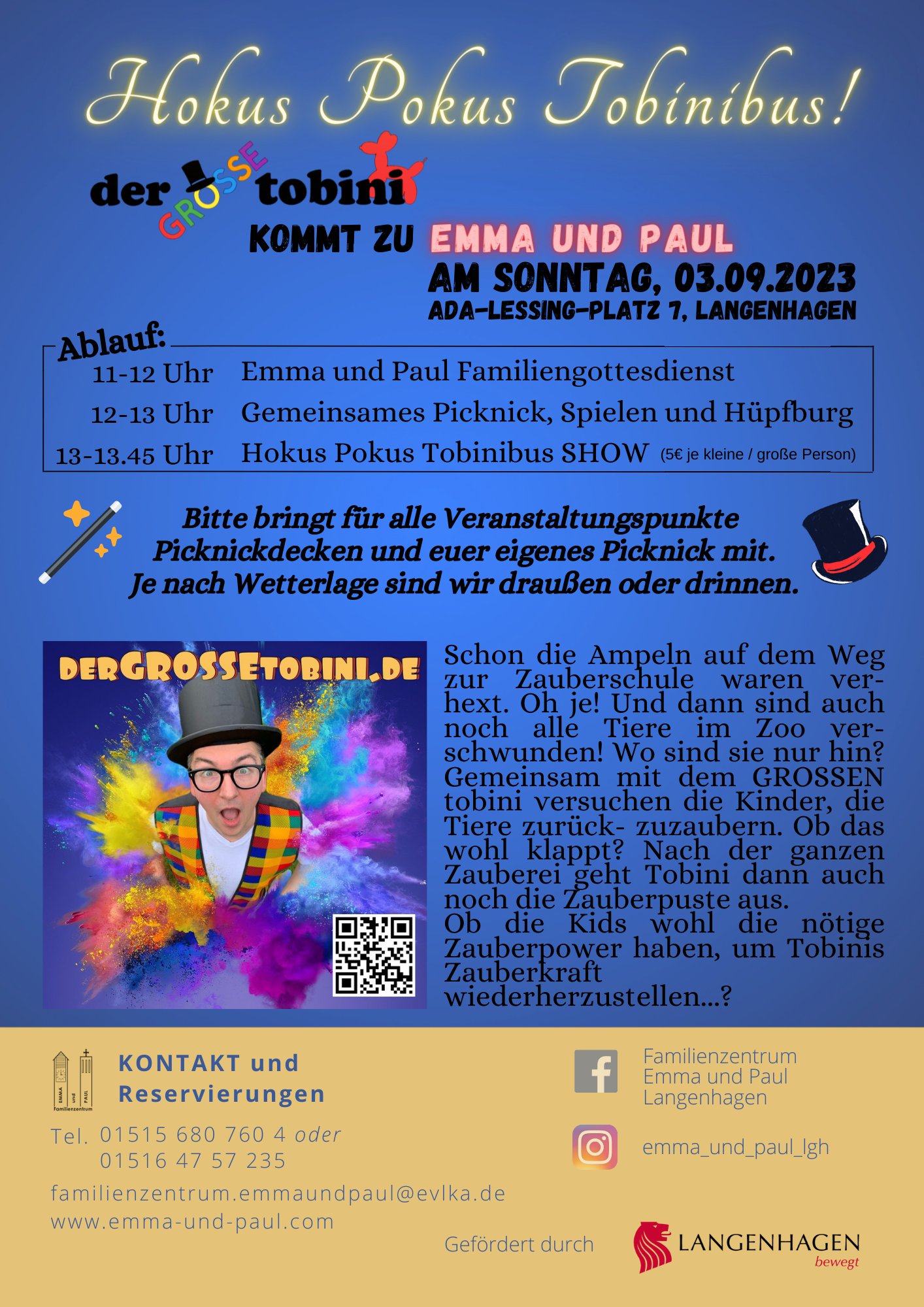 Wir freuen uns sehr auf eine zauberhafte Show am 03.09.2023 (Ada-Lessing-Platz 7 in Langenhagen). Davor seid ihr herzlich zu unserem Familiengottesdienst eingeladen. Die Mittagszeit zwischen Gottesdienst und Zaubershow nutzen wir für ein gemeinsames Picknick (bitte mitbringen), gemeinsames Plaudern und Kinderspaß.